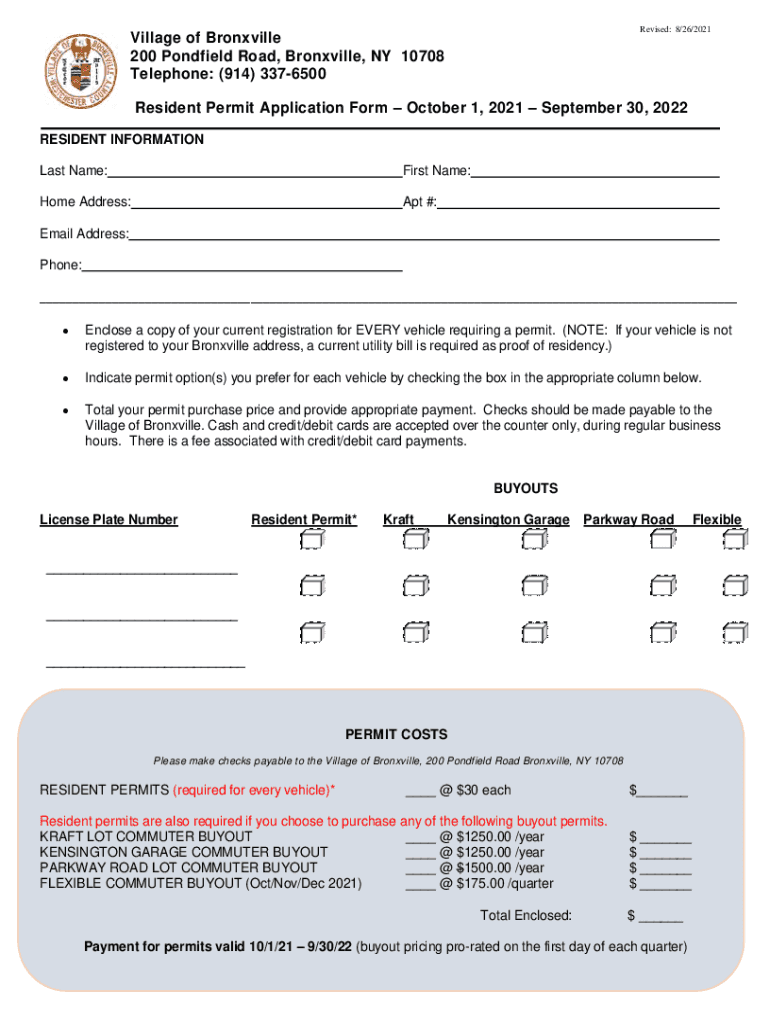 Revised: 8/26/2021Village of Brownsville 200 Pond field Road, Brownsville, NY 10708 Telephone: (914) 3376500Resident Permit Application Form October 1, 2021, September 30, 2022, RESIDENT INFORMATION