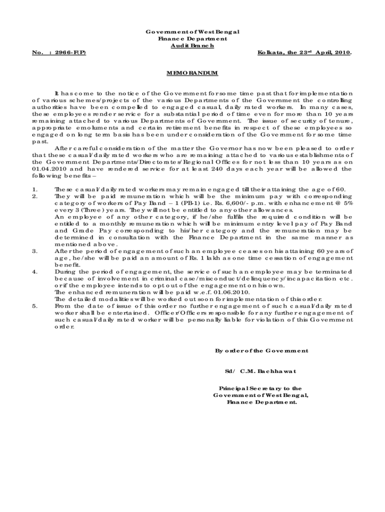 No. 2966F(P)Government of West Bengal Finance Department Audit BranchKolkata, the 23rd April 2010.MEMORANDUM It has come to the notice of the Government for some time past that for implementation