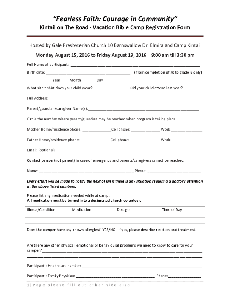Fearless Faith: Courage in CommunityKintail on The Road Vacation Bible Camp Registration Forested by Gale Presbyterian Church 10 Barn swallow Dr. Elmira and Camp KintailMonday August 15, 2016, to