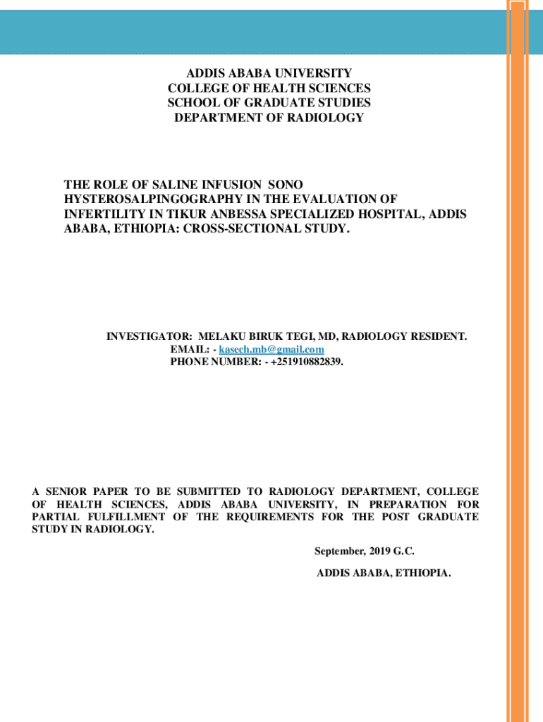ADDIS ABABA UNIVERSITY COLLEGE OF HEALTH SCIENCES SCHOOL OF GRADUATE STUDIES DEPARTMENT OF RADIOLOGY ROLE OF SALINE INFUSION SON HYSTEROSALPINGOGRAPHY IN THE EVALUATION OF INFERTILITY IN TIMUR VANESSA