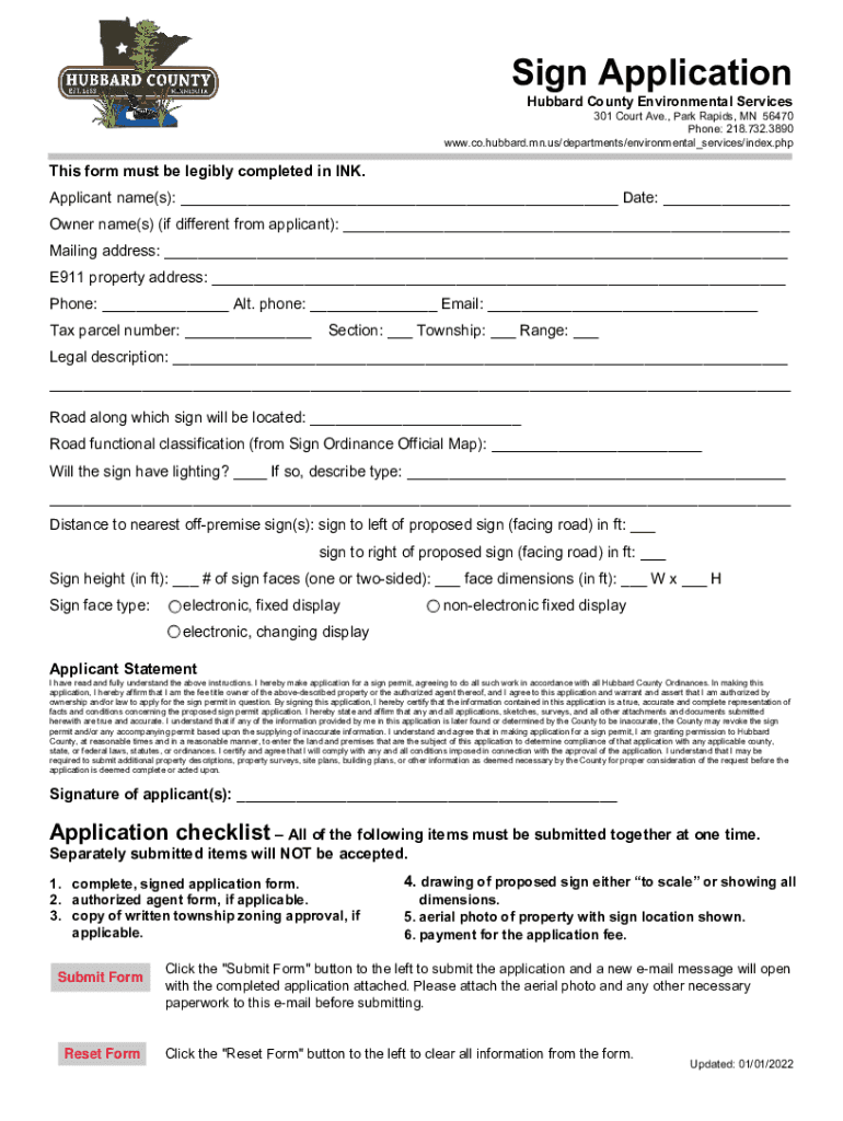 Sign Application Hubbard County Environmental Services 301 Court Ave., Park Rapids, MN 56470 Phone: 218.732.3890 www.co.hubbard.mn.us/departments/environmental_services/index.phpFAQs: What requires