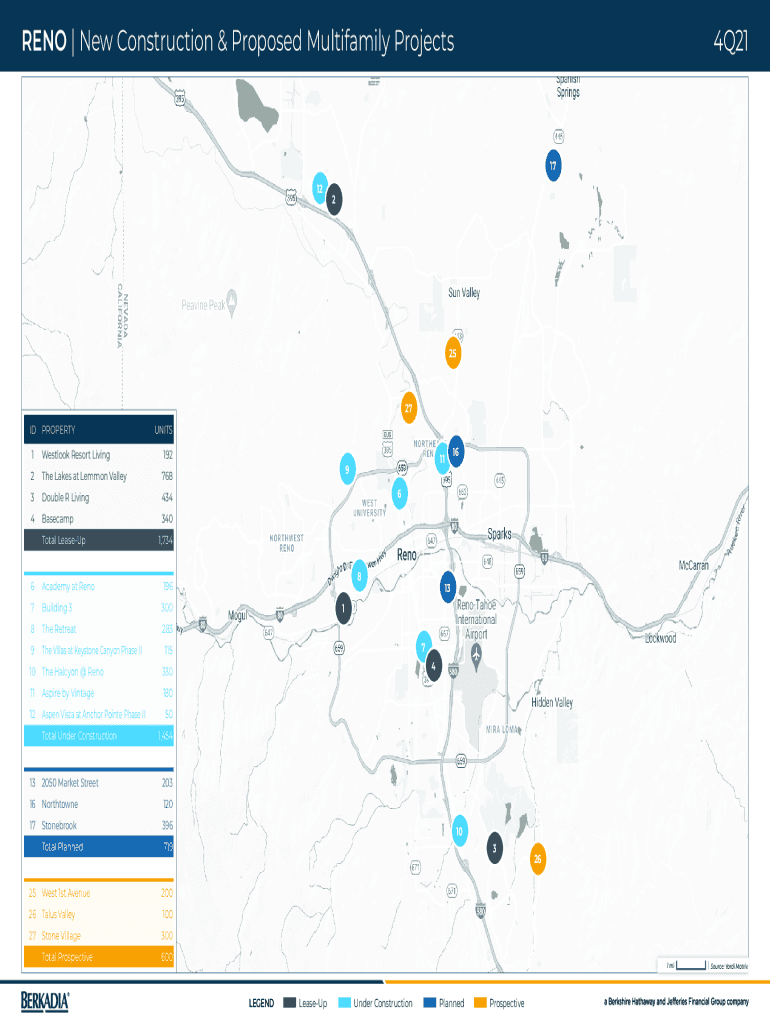 RENO | New Construction & Proposed Multifamily Projects4Q2117 1222527 IDPROPERTYUNITS1Westlook Resort Living1922The Lakes at Lemon Valley7683Double R Living4344Basecamp340Total LeaseUpAcademy at Reno7Building