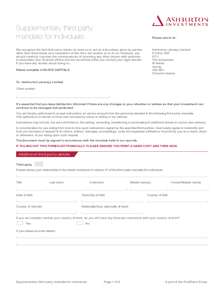 Third Party AuthoritySupplementary third party mandate for individualsPlease return to:Ashburn (Jersey) Limited PO Box 239 IFC1 The Esplanade St Helper Jersey JE4 8SJ Channel Islands recognize the