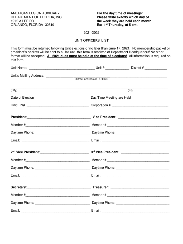AMERICAN LEGION AUXILIARY DEPARTMENT OF FLORIDA, INC 1912 A LEE RD ORLANDO, FLORIDA 32810For the day/time of meetings: Please write exactly which day of the week they are held each month Ex: 1st Thursday,