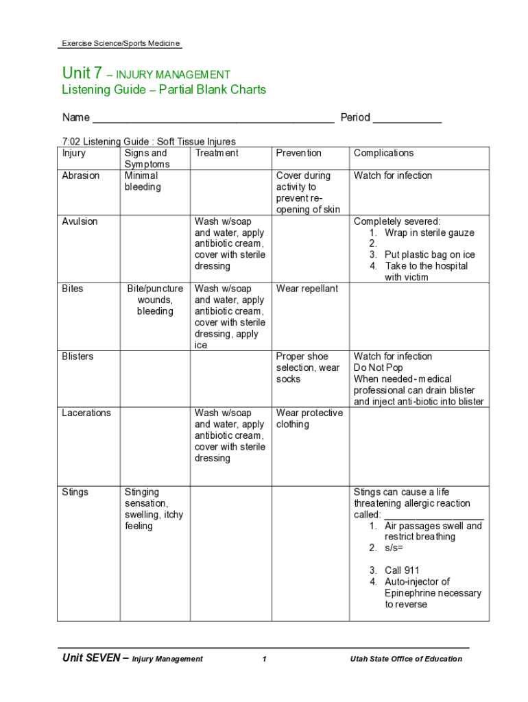 Back Exercise Science/Sports MedicineUnit 7 INJURY MANAGEMENT Listening Guide Partial Blank Charts Name ___ Period ___ 7:02 Listening Guide : Soft Tissue Injures Injury Signs and Treatment Symptoms