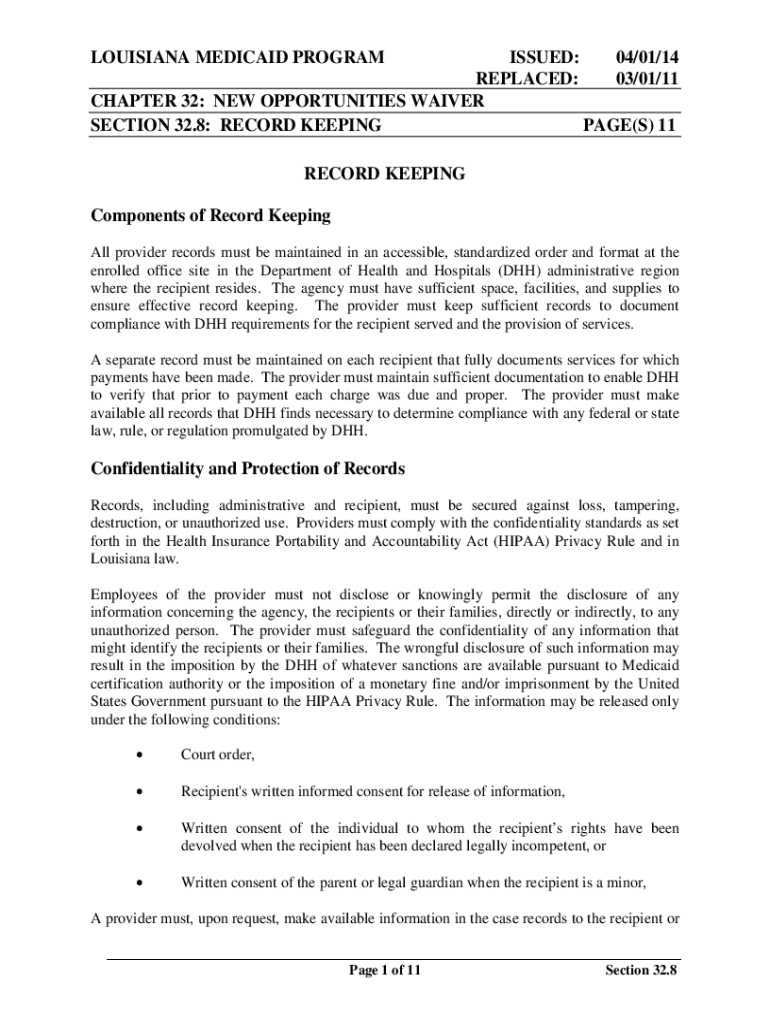LOUISIANA MEDICAID PROGRAMISSUED: 04/01/14 REPLACED: 03/01/11 CHAPTER 32: NEW OPPORTUNITIES WAIVER SECTION 32.8: RECORD KEEPING PAGE(S) 11 RECORD KEEPING Components of Record Keeping All provider