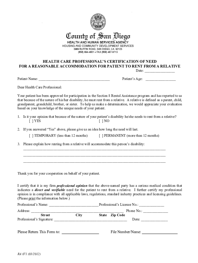 HEALTH CARE PROFESSIONALS CERTIFICATION OF NEED FOR REASONABLE ACCOMMODATION FOR PATIENT TO RENT FROM A RELATIVE Date: ___Patient Name: ___Patients Age: ___Dear Health Care Professional: Your patient