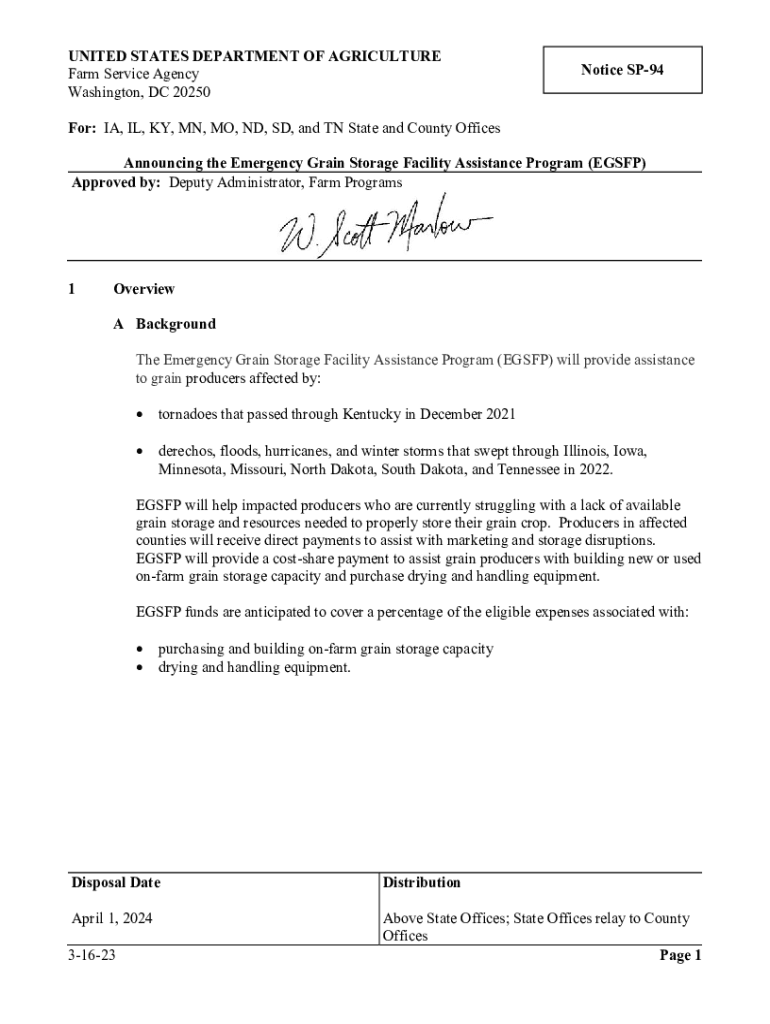 UNITED STATES DEPARTMENT OF AGRICULTURE Farm Service Agency Washington, DC 20250Notice SP94For: IA, IL, KY, MN, MO, ND, SD, and TN State and County Offices Announcing the Emergency Grain Storage Facility