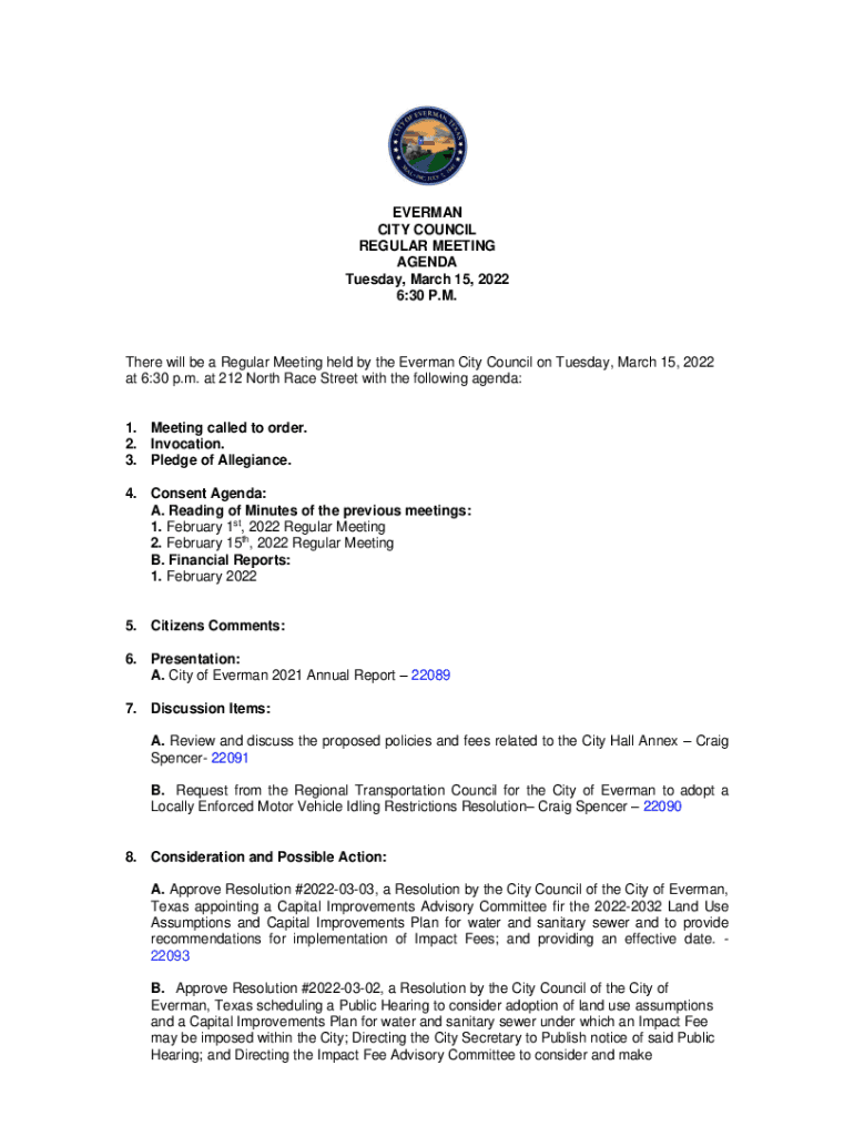 GERMAN CITY COUNCIL REGULAR MEETING AGENDA Tuesday, March 15, 2022 6:30 P.M. There will be a Regular Meeting held by the Ever man City Council on Tuesday, March 15, 2022, at 6:30 p.m. at 212 North