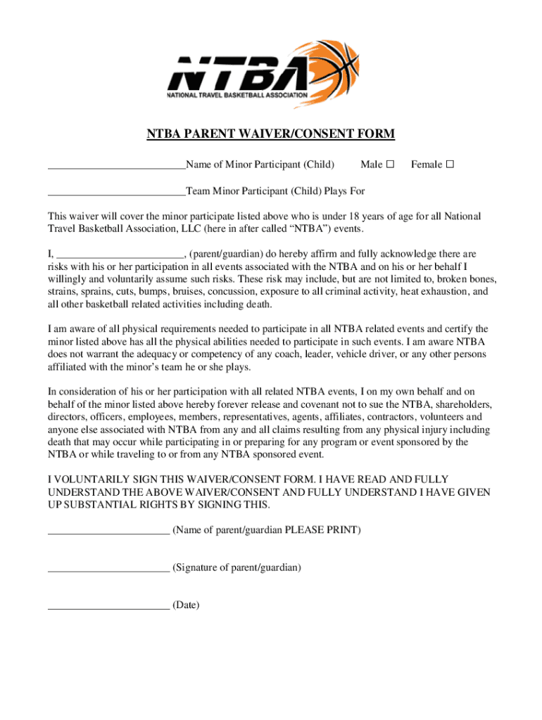 Any parent or legal guardian of a player participating in the NTBA (National Travel Basketball Association) events will need to fill out the parent waiver/consent form.