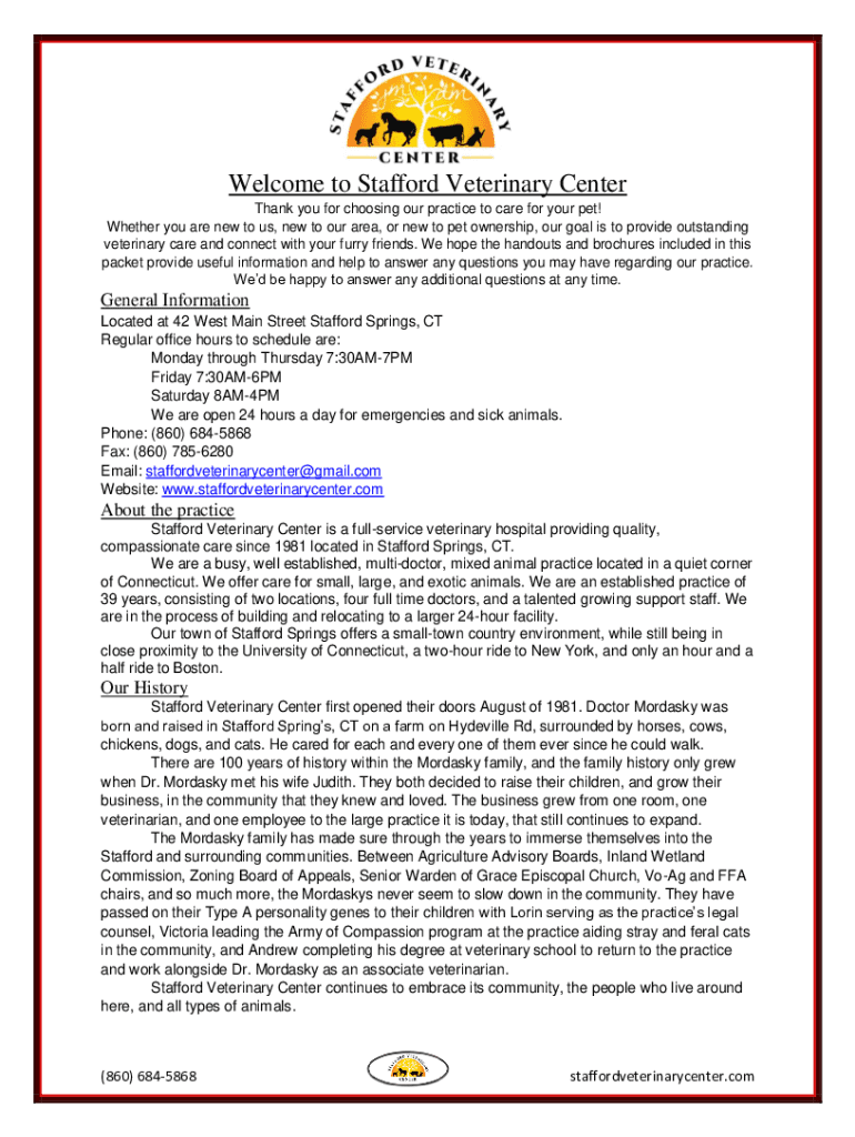 Welcome to Stafford Veterinary Center Thank you for choosing our practice to care for your pet! Whether you are new to us, new to our area, or new to pet ownership, our goal is to provide outstanding