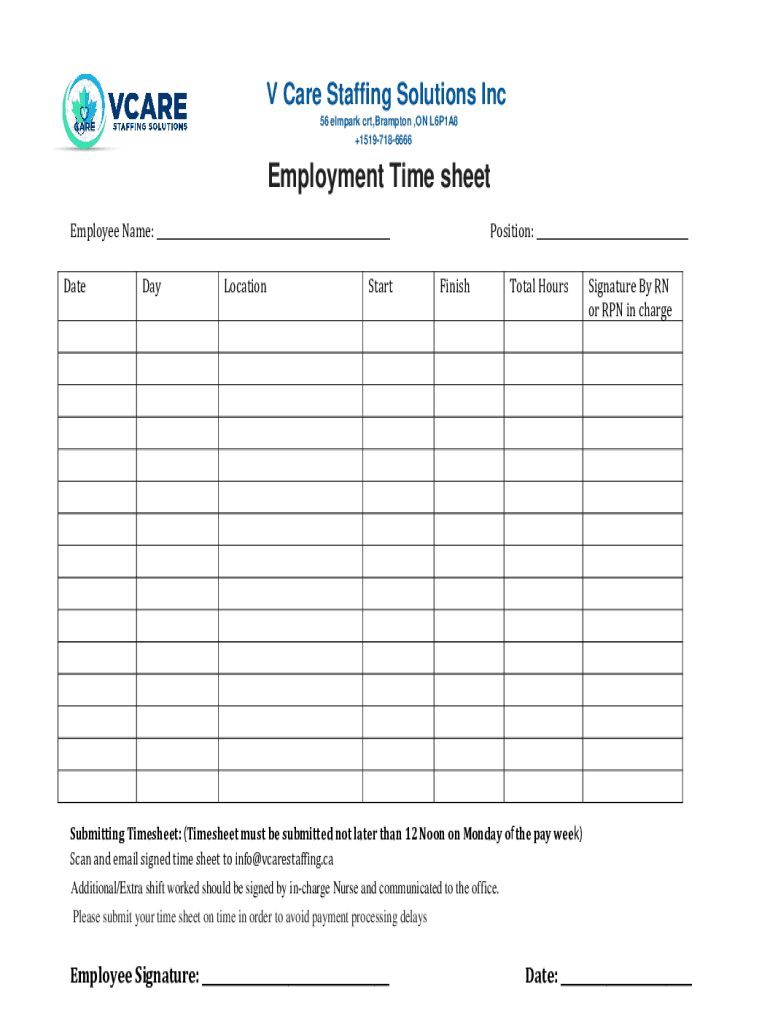 Employees must fill out the employment time sheet by documenting their hours worked each day and submitting it to their employer for review and approval.