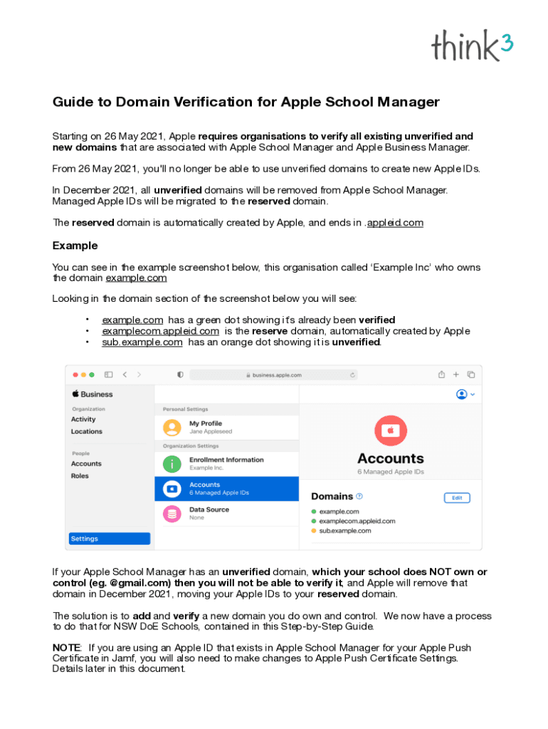 Guide to Domain Verification for Apple School Manager Starting on 26May 2021, Apple requires organizations to verify all existing unverified and new domains that are associated with Apple School Manager