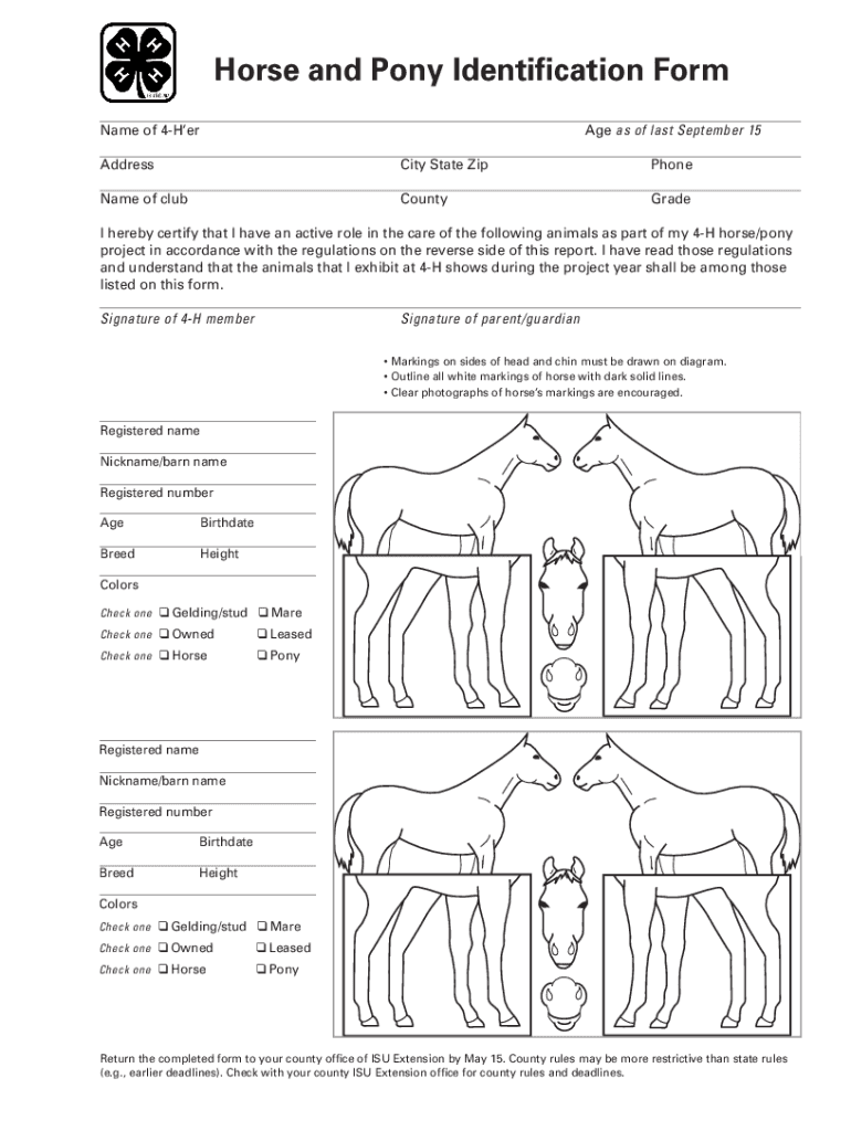 Horse and Pony Identification Form Name of 4HerAge as of last September 15 ................................ Addressing State ZipPhoneName of clubCountyGradeI hereby certify that I have an active role