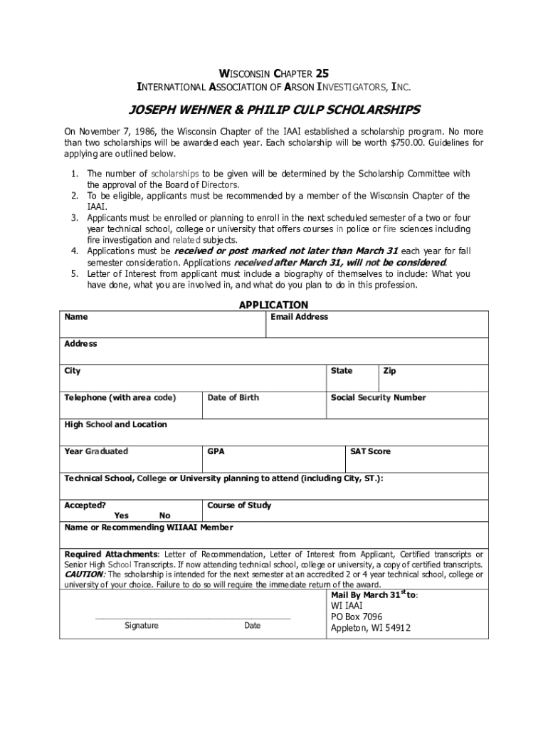 WISCONSIN CHAPTER 25 INTERNATIONAL ASSOCIATION OF ARSON INVESTIGATORS, INC.JOSEPH WERNER & PHILIP CULT SCHOLARSHIPS On November 7, 1986, the Wisconsin Chapter of the IAA established a scholarship