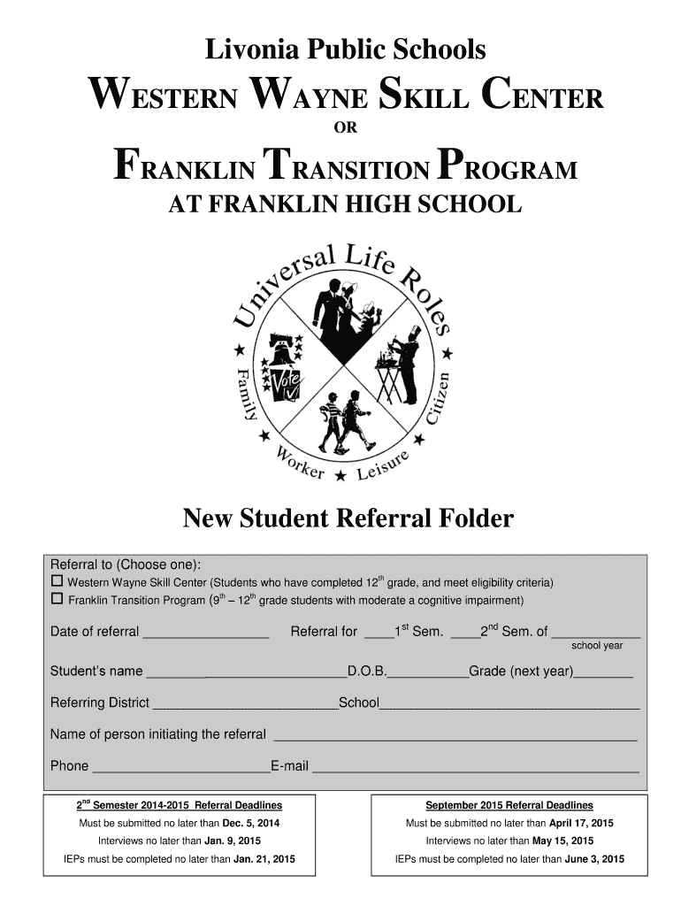 Livonia Public Schools WESTERN WAYNE SKILL CENTER OR FRANKLIN TRANSITION PROGRAM AT FRANKLIN HIGH SCHOOL New Student Referral Folder Referral to (Choose one): Western Wayne Skill Center (Students