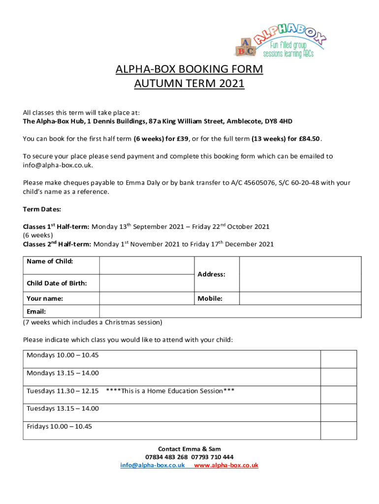 ALPHA BOX BOOKING FORM AUTUMN TERM 2021 All classes this term will take place at: The Alphabet Hub, 1 Dennis Buildings, 87a King William Street, Amble cote, DY8 4HD You can book for the first half-term