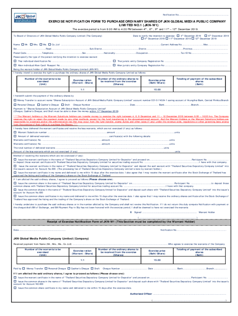 Notification No.....................................................................EXERCISE NOTIFICATION FORM TO PURCHASE ORDINARY SHARES OF JON GLOBAL MEDIA PUBLIC COMPANY LIMITED NO.1 (JKNW1) The