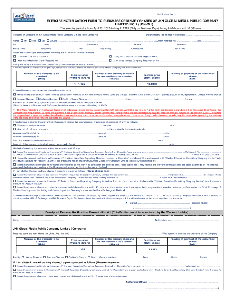 Notification No.....................................................................EXERCISE NOTIFICATION FORM TO PURCHASE ORDINARY SHARES OF JON GLOBAL MEDIA PUBLIC COMPANY LIMITED NO.1 (JKNW1) The