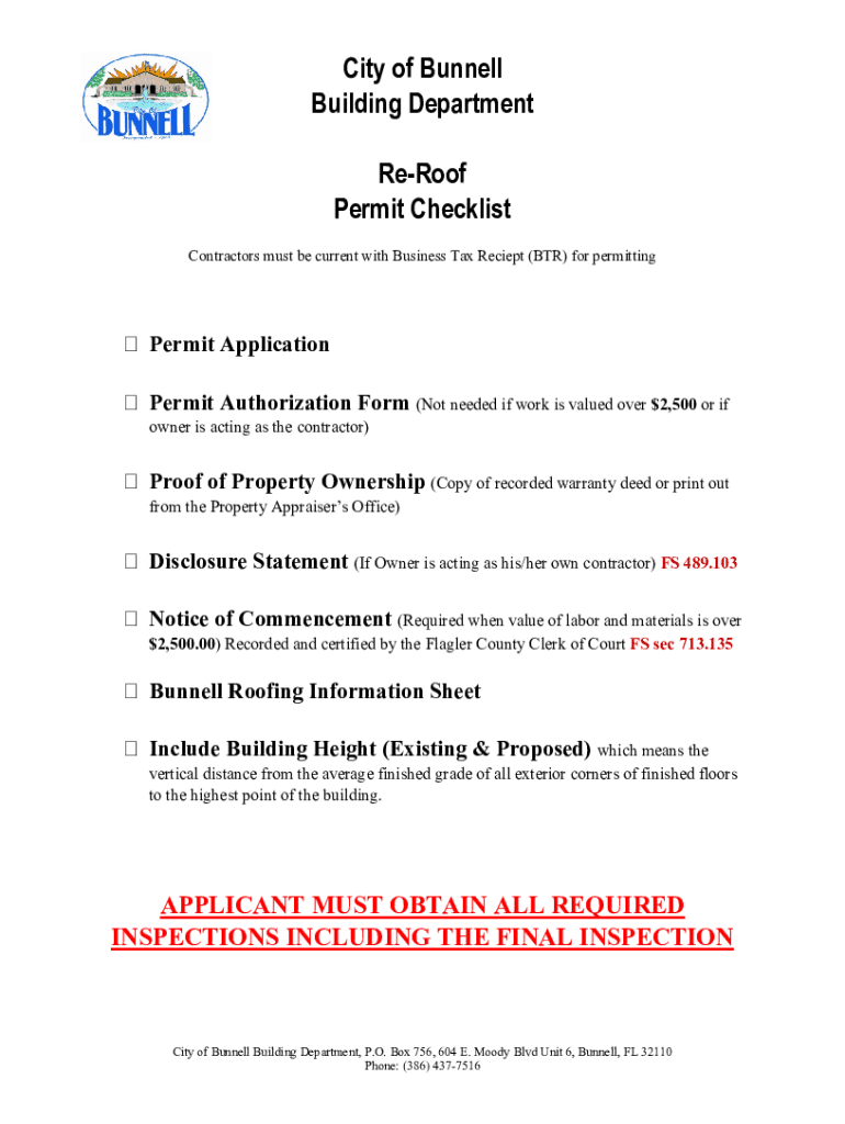 City of Bonnell Building Department Reproof Permit Checklist Contractors must be current with Business Tax Receipt (BTR) for permittingPermit Application Permit Authorization Form (Not needed if work