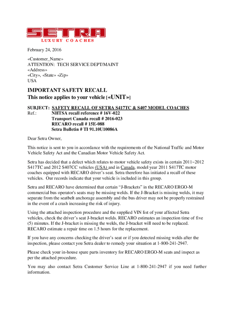 LUXURY COACHES February 24, 2016, Customer_Name ATTENTION: TECH SERVICE DEPT/MAIN Address City, State Zip UNIMPORTANT SAFETY RECALL This notice applies to your vehicle [UNIT] SUBJECT: SAFETY RECALL