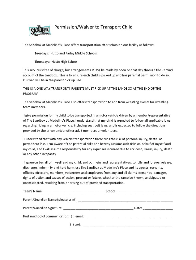 Permission/Waiver to Transport Children Sandbox at Madeline's Place offers transportation after school to our facility as follows: Tuesdays: Bhutto and Farley Middle Schools Thursdays: Bhutto High