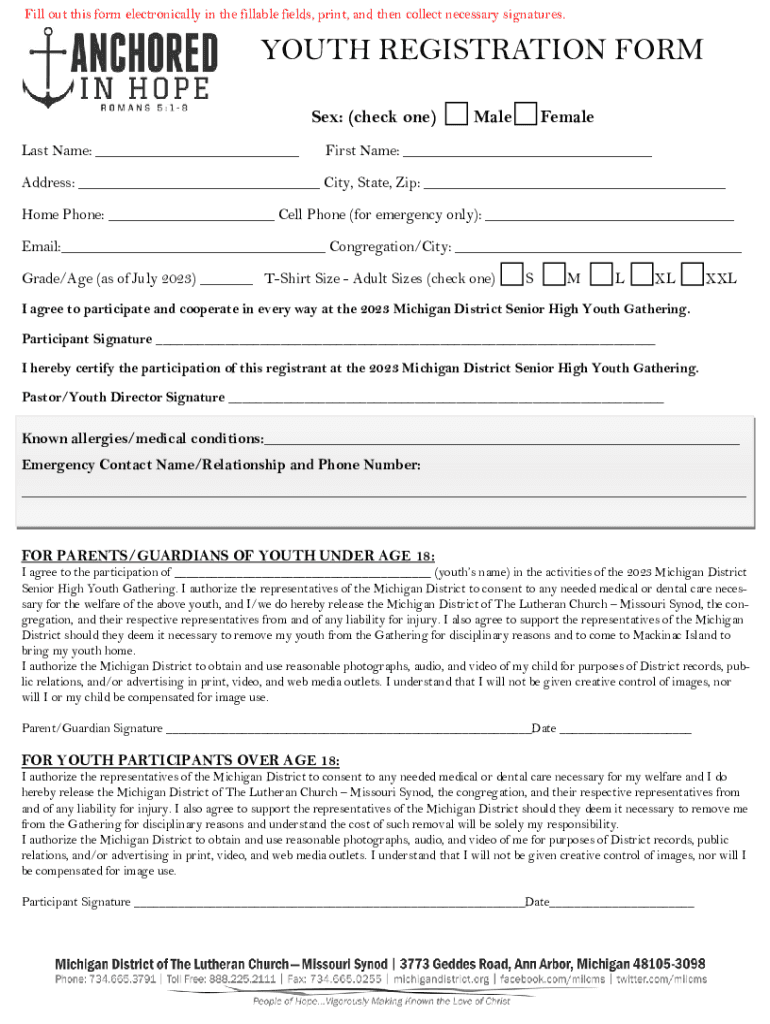 Fill out this form electronically in the fillable fields, print, and then collect necessary signatures. YOUTH REGISTRATION FORM Sex: (check one) Last Name: ___MaleFemaleFirst Name: ___Address: ___