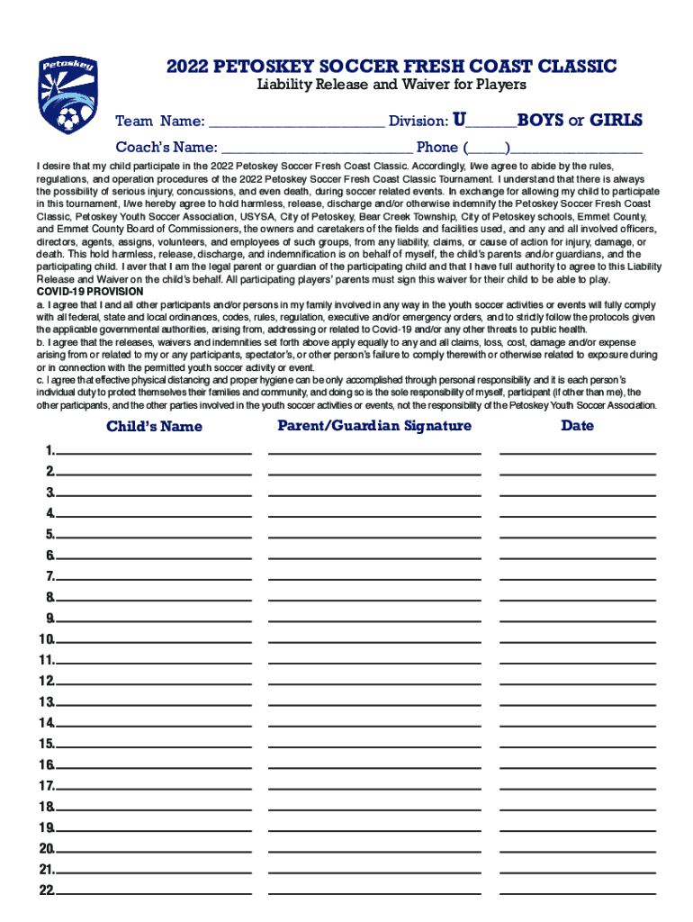 2022 PESKY SOCCER FRESH COAST CLASSIC Liability Release and Waiver for PlayersTeam Name: ___ Division: U___BOYS or GIRLS Coach Name: ___ Phone (___)___ I desire that my child participate in the 2022