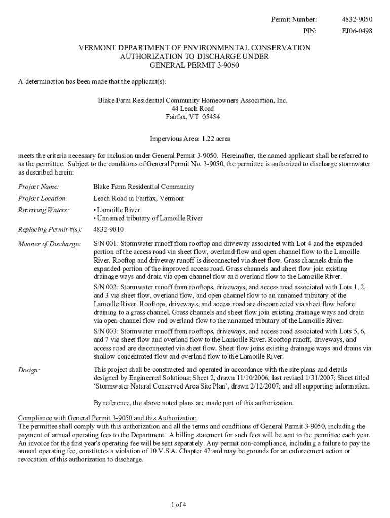 Permit Number:48329050PIN:EJ060498VERMONT DEPARTMENT OF ENVIRONMENTAL CONSERVATION AUTHORIZATION TO DISCHARGE UNDER GENERAL PERMIT 39050 A determination has been made that the applicant(s): Blake