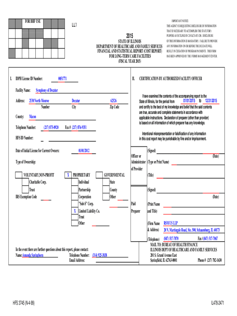 FOR BHF USELL1 2015 STATE OF ILLINOIS DEPARTMENT OF HEALTHCARE AND FAMILY SERVICES FINANCIAL AND STATISTICAL REPORT (COST REPORT) FOR LONGER CARE FACILITIES (FISCAL YEAR 2015)I.DPH License ID Number: