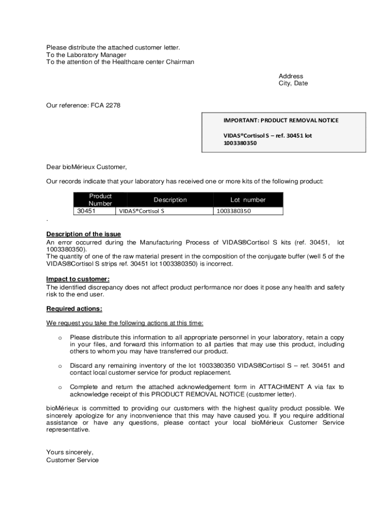Please distribute the attached customer letter. To the Laboratory Manager To the attention of the Healthcare center Chairman Address City, Date. Our reference: FCA 2278IMPORTANT:PRODUCTREMOVALNOTICE