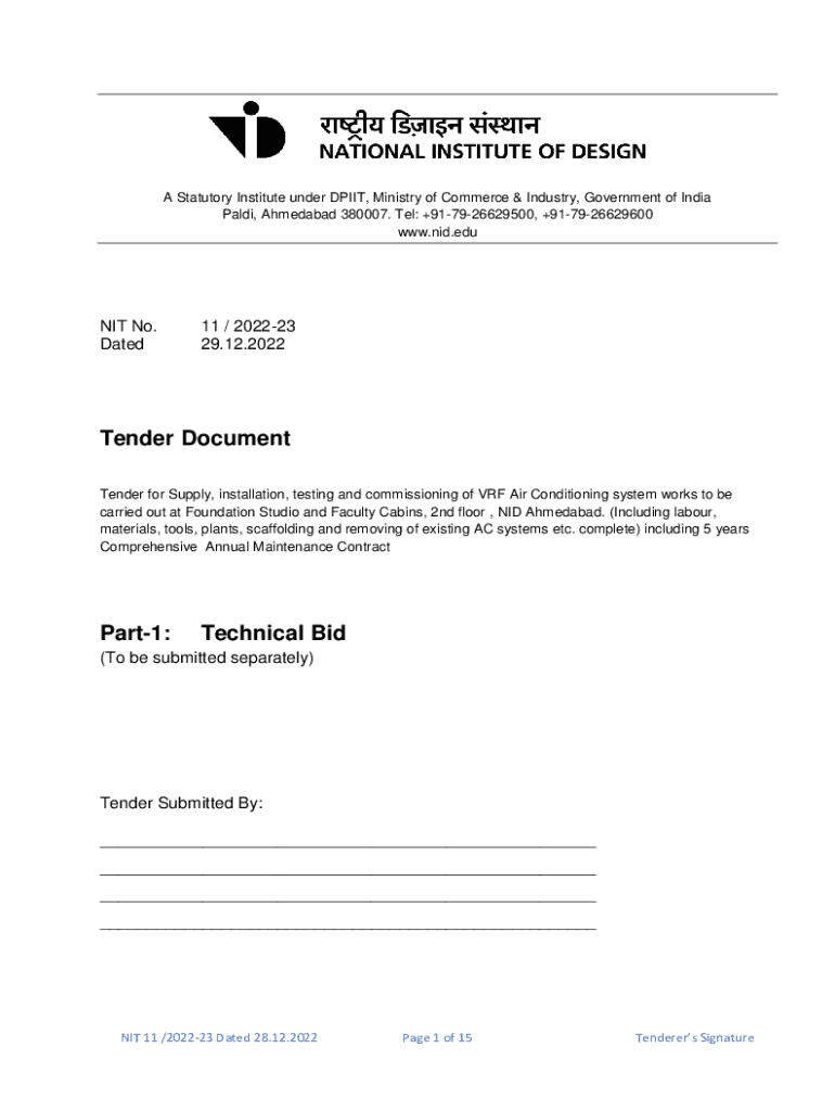 A Statutory Institute under DP IIT, Ministry of Commerce & Industry, Government of India Aldi, Ahmedabad 380007. Tel: +917926629500, +917926629600 www.nid.eduNIT No. Dated11 / 202223 29.12.2022Tender