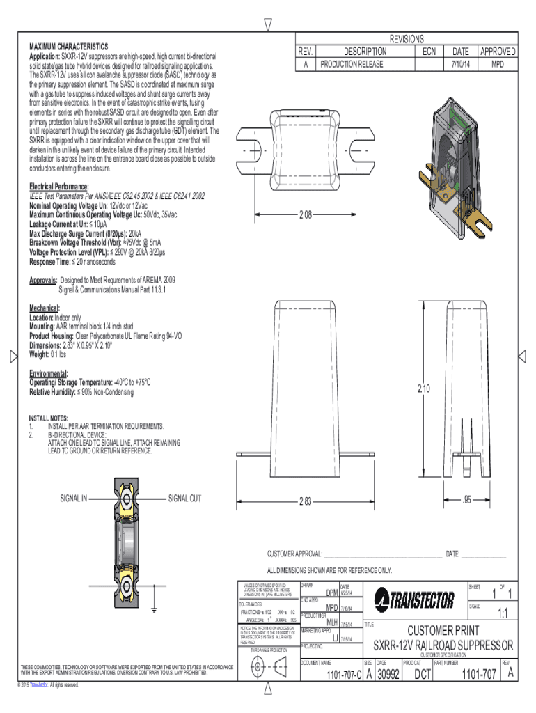 MAXIMUM CHARACTERISTICS Application: SXXR12V suppressors are high speed, high current bidirectional solid state/gas tube hybrid devices designed for railroad signaling applications. The SXRR12V uses