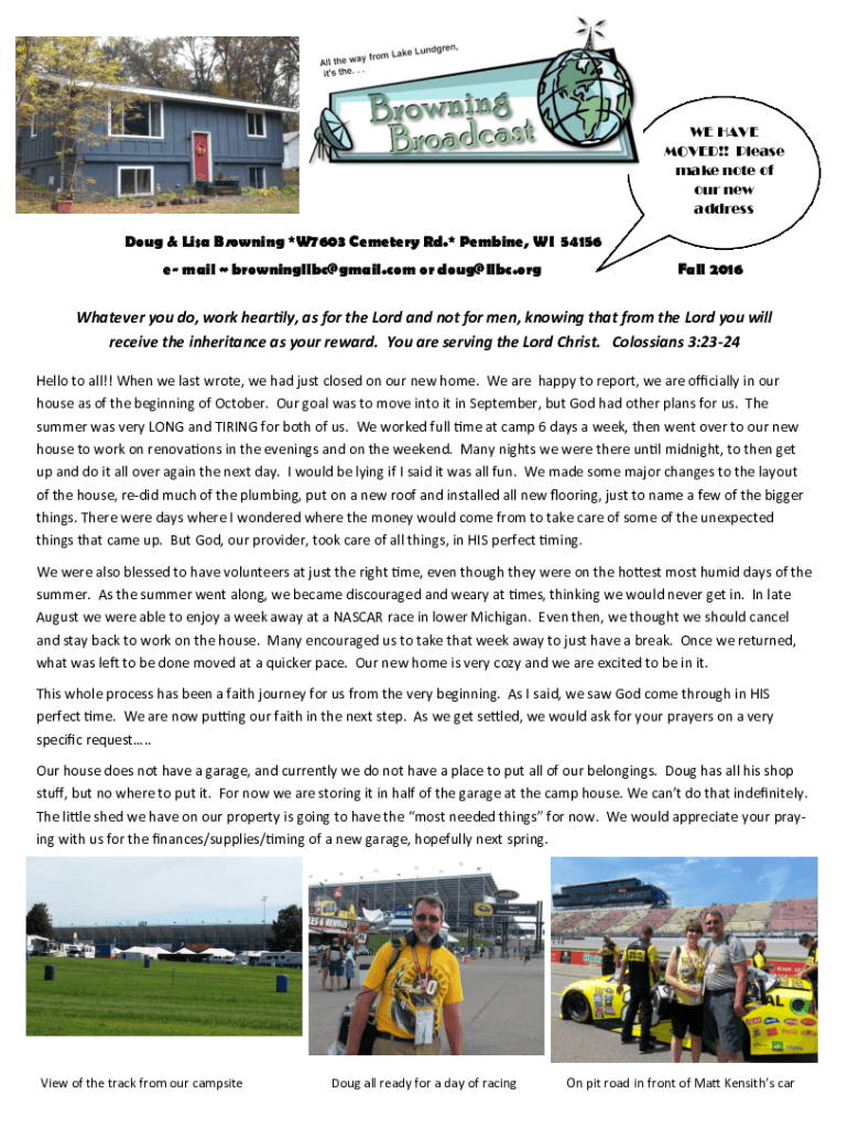 WE HAVE MOVED!! Please make note of our new address Doug & Lisa Browning *W7603 Cemetery Rd.* Combine, WI 54156 e-mail browningllbc@gmail.com or doug@llbc.orgFall 2016Whatever you do, work heartily,