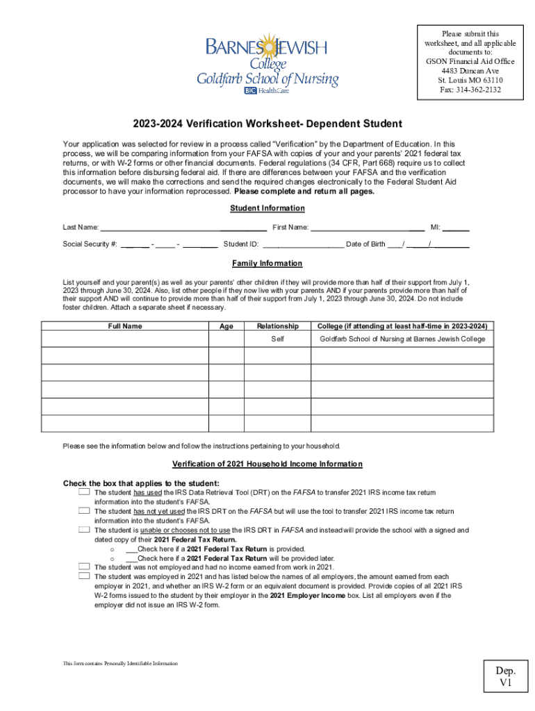 Please submit this worksheet, and all applicable documents to: SON Financial Aid Office 4483 Duncan Ave St. Louis MO 63110 Fax: 314362213220232024 Verification Worksheet Dependent Student Your application
