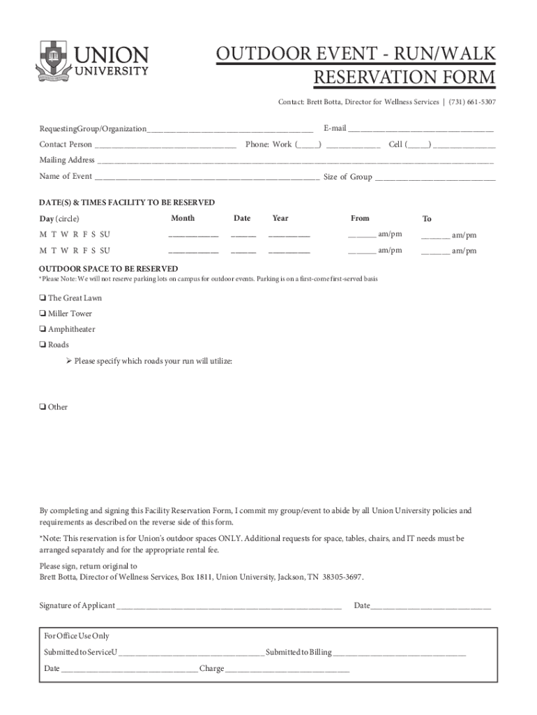 OUTDOOR EVENT RUN/WALK RESERVATION FORM Contact: Brett Gotta, Director for Wellness Services | (731) 6615307Email ___ Contact Person ___Phone: Work (___) ___ Cell (___) ___Mailing Address ___Size