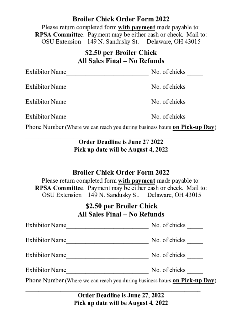 Broiler Chick Order Form 2022Please return completed form with payment made payable to: ROSA Committee. Payment may be either cash or check. Mail to: OSU Extension 149 N. Sandusky St. Delaware, OH
