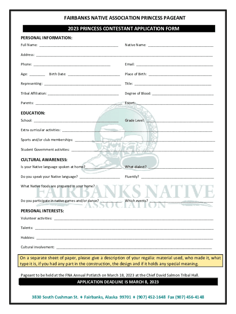FAIRBANKS NATIVE ASSOCIATION PRINCESS PAGEANT 2023 PRINCESS CONTESTANT APPLICATION FORM PERSONAL INFORMATION: Full Name: ___Native Name: ___Address: ___ Phone: ___Email: ___Age: ___Place of Birth:
