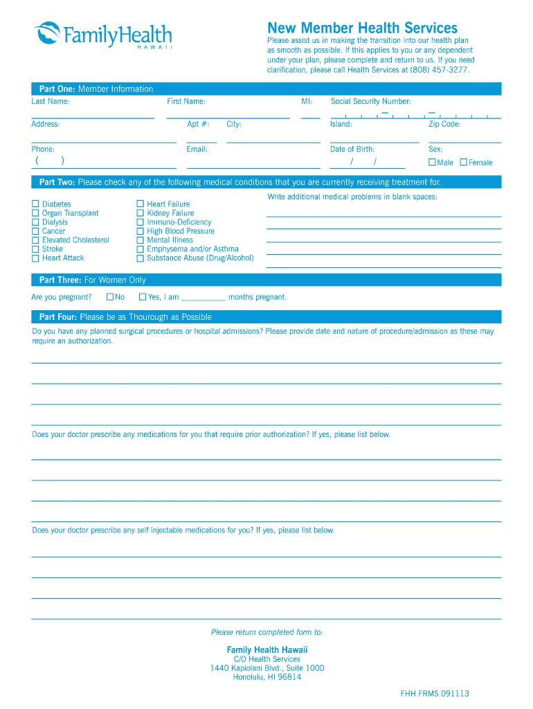 New Member Health Services Please assist us in making the transition into our health plan as smooth as possible. If this applies to you or any dependent under your plan, please complete and return