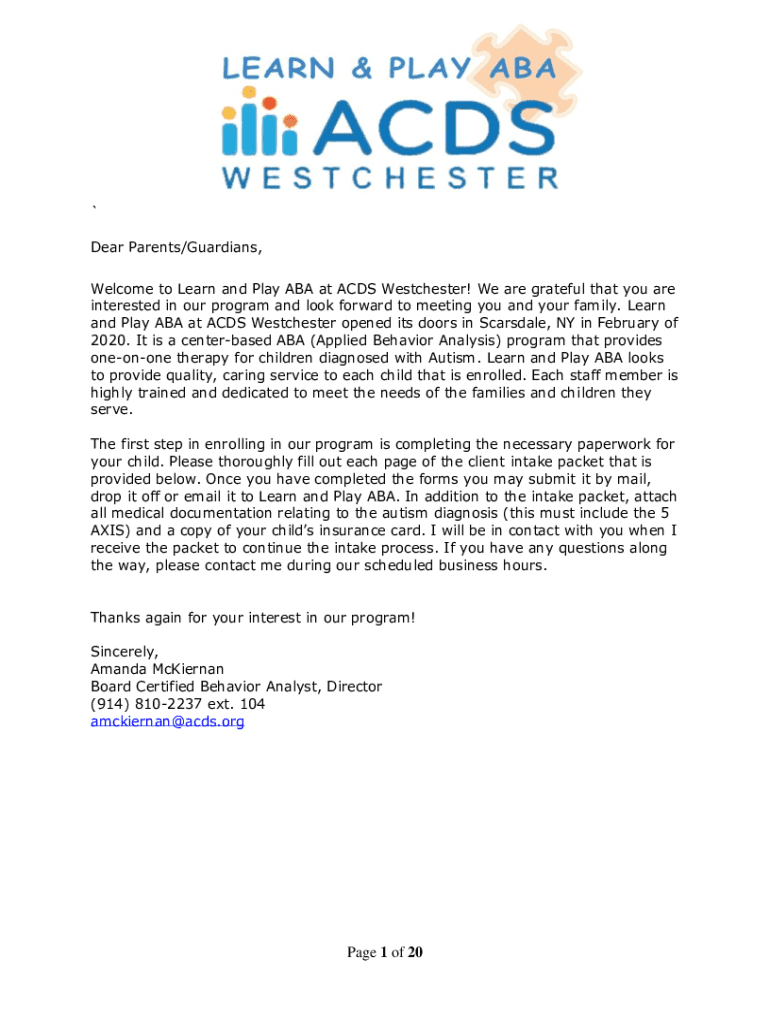 ` Dear Parents/Guardians, Welcome to Learn and Play ABA at ACTS Westchester! We are grateful that you are interested in our program and look forward to meeting you and your family. Learn and Play