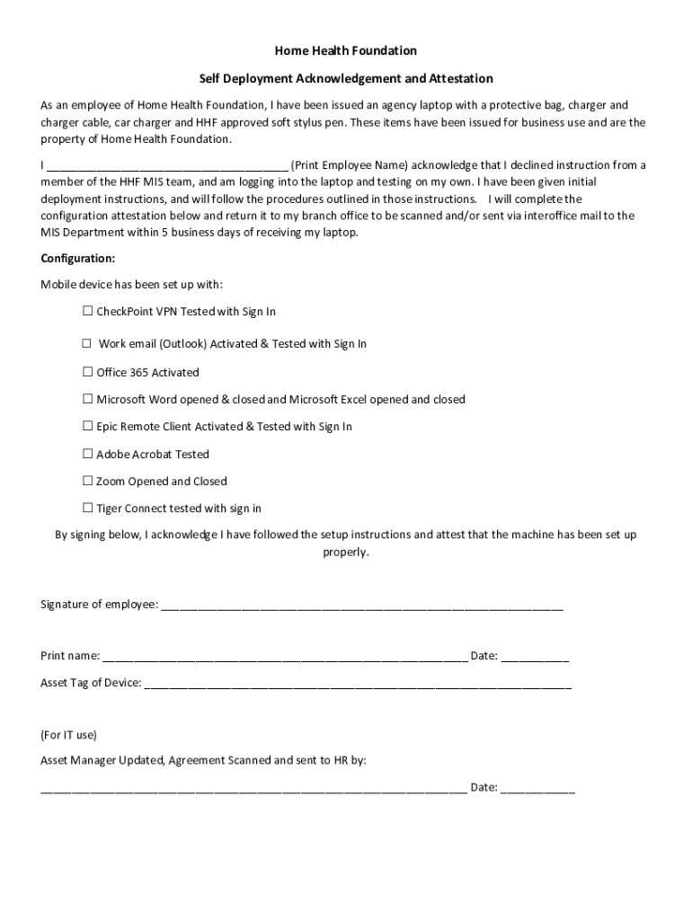 Home Health Foundation Self Deployment Acknowledgement and Attestation As an employee of Home Health Foundation, I have been issued an agency laptop with a protective bag, charger and charger cable,