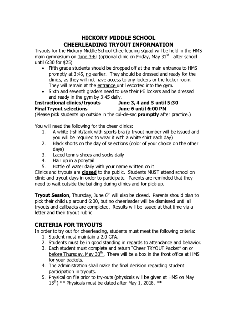HICKORY MIDDLE SCHOOL CHEERLEADING TRYOUT INFORMATIONTryouts for the Hickory Middle School Cheerleading squad will be held in the HMS main gymnasium on June 36: (optional clinic on Friday, May 31st