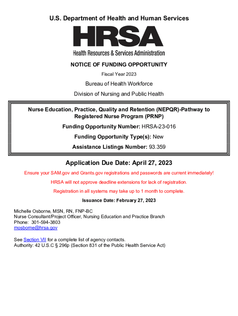U.S. Department of Health and Human ServicesNOTICE OF FUNDING OPPORTUNITY Fiscal Year 2023Bureau of Health Workforce Division of Nursing and Public Health Nurse Education, Practice, Quality and Retention