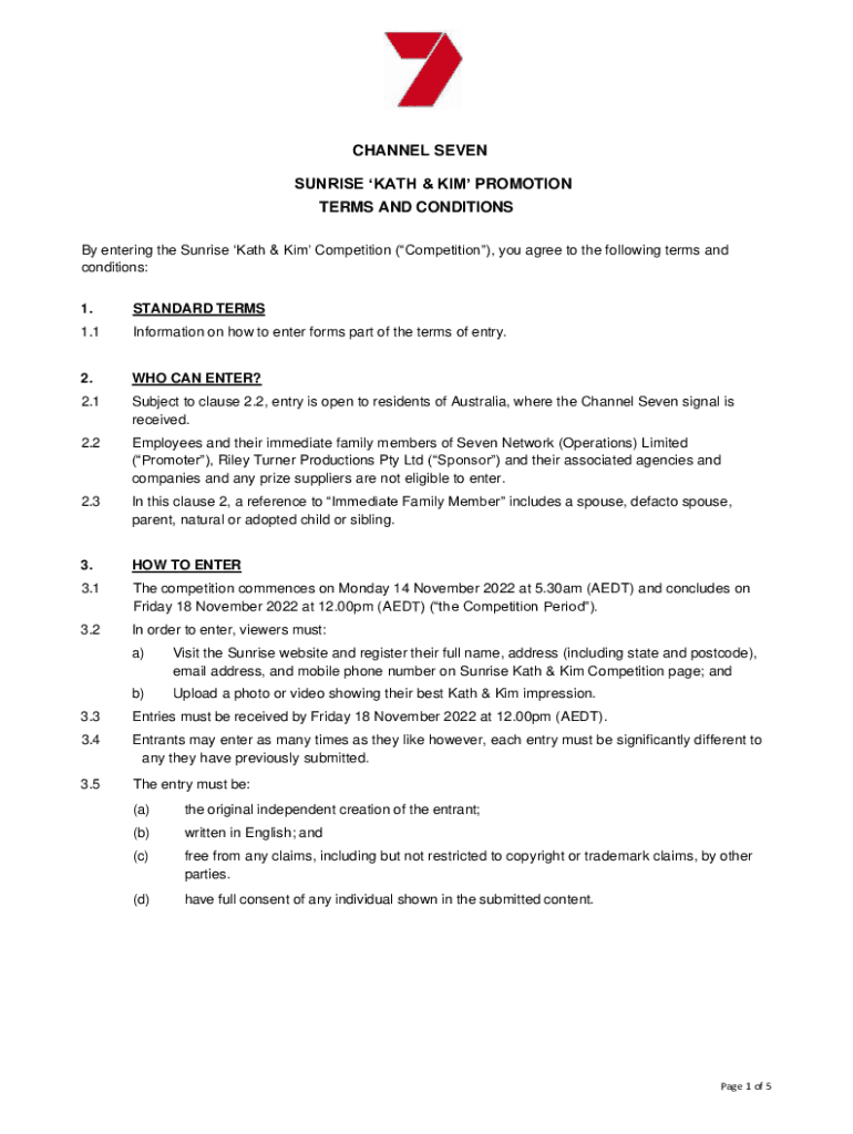 CHANNEL SEVEN SUNRISE KATH & KIM PROMOTION TERMS AND CONDITIONS By entering the Sunrise Kath & Kim Competition (Competition), you agree to the following terms and conditions: 1.STANDARD TERMS1.1Information