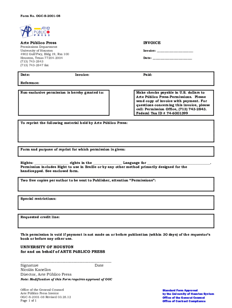 Form No. OGCS200108Arte Public PressINVOICEPermissions Department University of Houston 4902 Gulf Fwy, Bldg 19, Rm 100 Houston, Texas 772042004 (713) 7432843 (713) 7432847 mandate:Invoice: ___ Date: