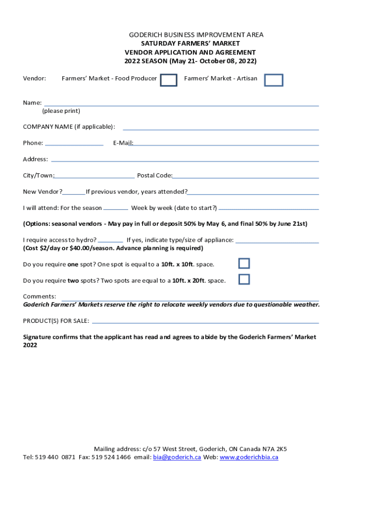 RODERICK BUSINESS IMPROVEMENT AREA SATURDAY FARMERS MARKET VENDOR APPLICATION AND AGREEMENT 2022 SEASON (May 21 October 08, 2022) Vendor:Farmers Market Food ProducerFarmers Market Artisanal: (please