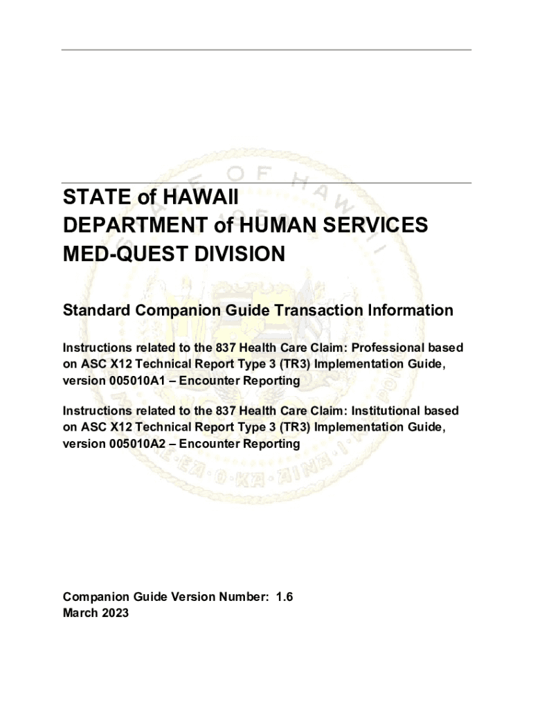 STATE of HAWAII DEPARTMENT of HUMAN SERVICES REQUEST DIVISION Standard Companion Guide Transaction Information Instructions related to the 837 Health Care Claim: Professional based on ASC X12 Technical