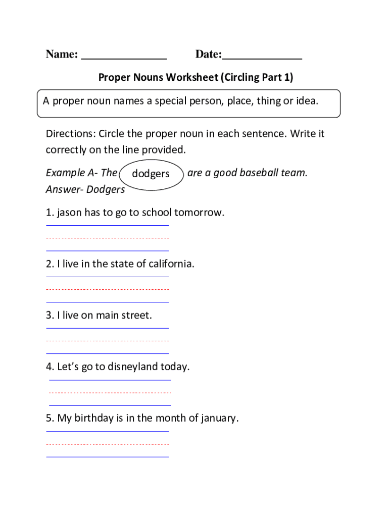 Name: ___Date:___Proper Nouns Worksheet (Circling Part 1) A proper noun names a special person, place, thing or idea. Directions: Circle the proper noun in each sentence. Write it correctly on the