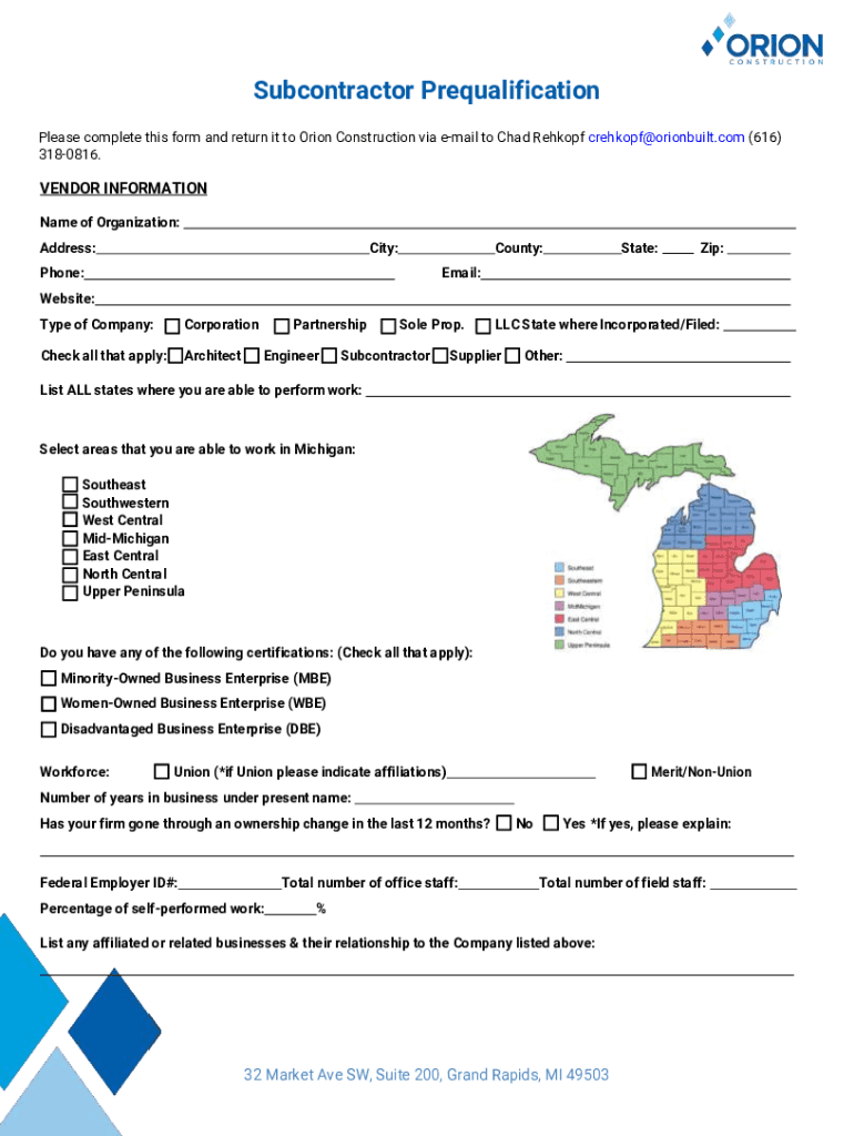 Get the free Subcontractor Prequalification - Orion Construction