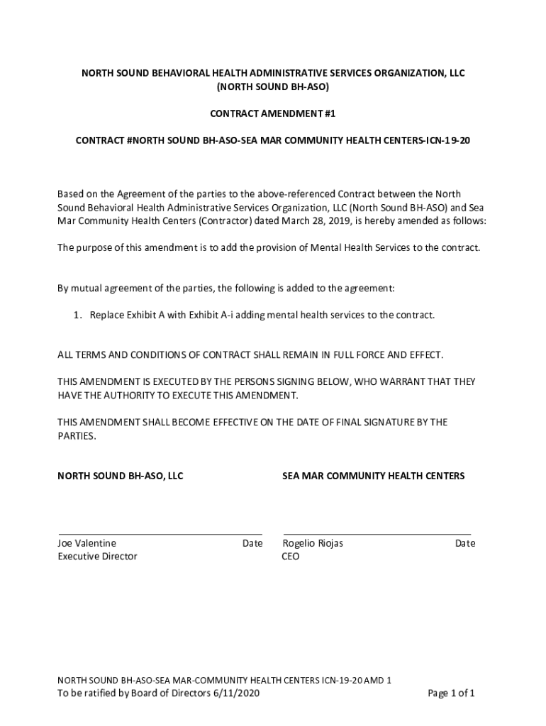 NORTH SOUND BEHAVIORAL HEALTH ADMINISTRATIVE SERVICES ORGANIZATION, LLC (NORTH SOUND BHA SO) CONTRACT AMENDMENT #1 CONTRACT #NORTH SOUND BASSES MAR COMMUNITY HEALTH CENTERSICN1920Based on the Agreement